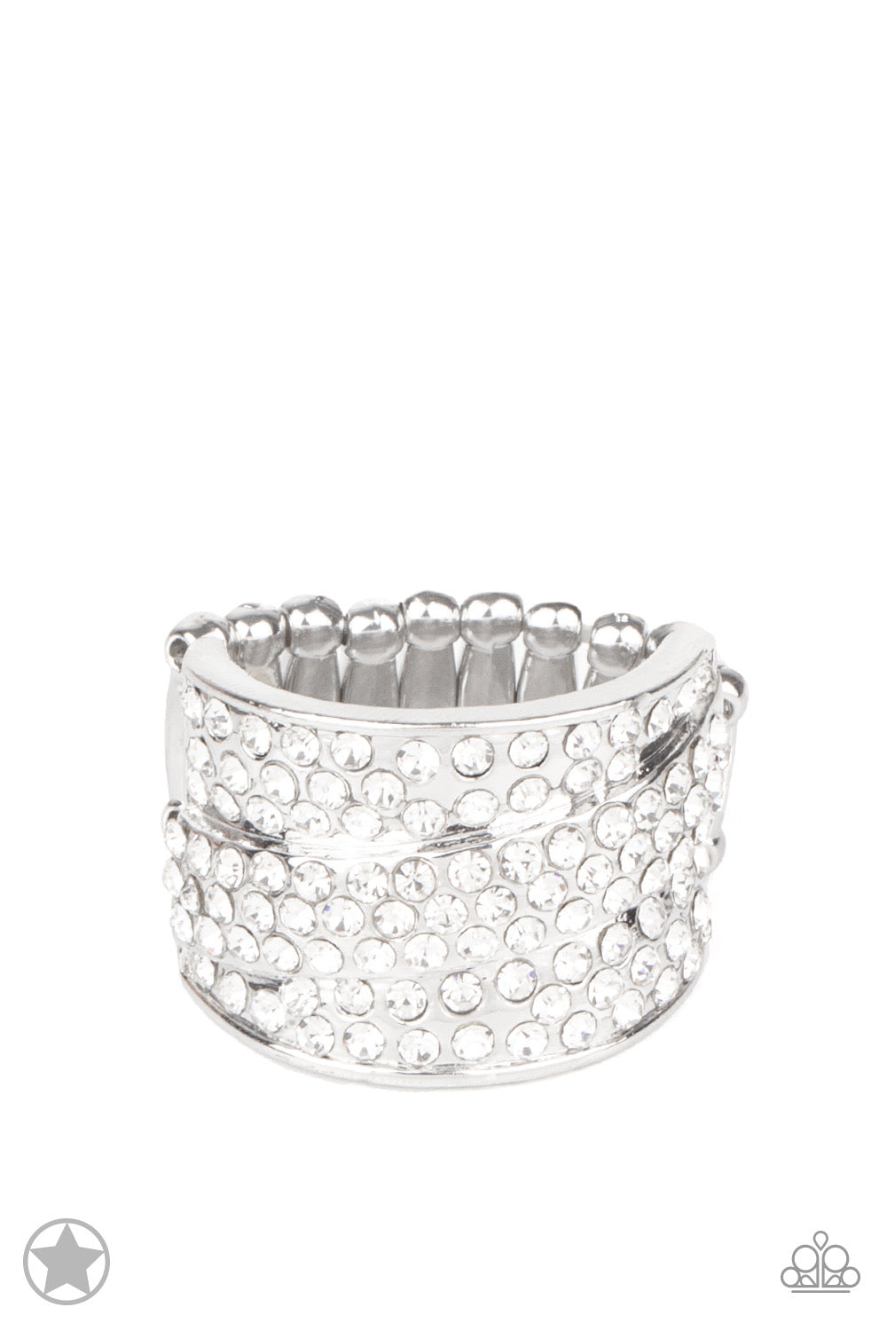Row upon row of glistening white rhinestones stack into an incandescent display. An additional row of sparkling rhinestones wraps diagonally across the band for an extra splash of refined shimmer. Features a stretchy band for a flexible fit.
