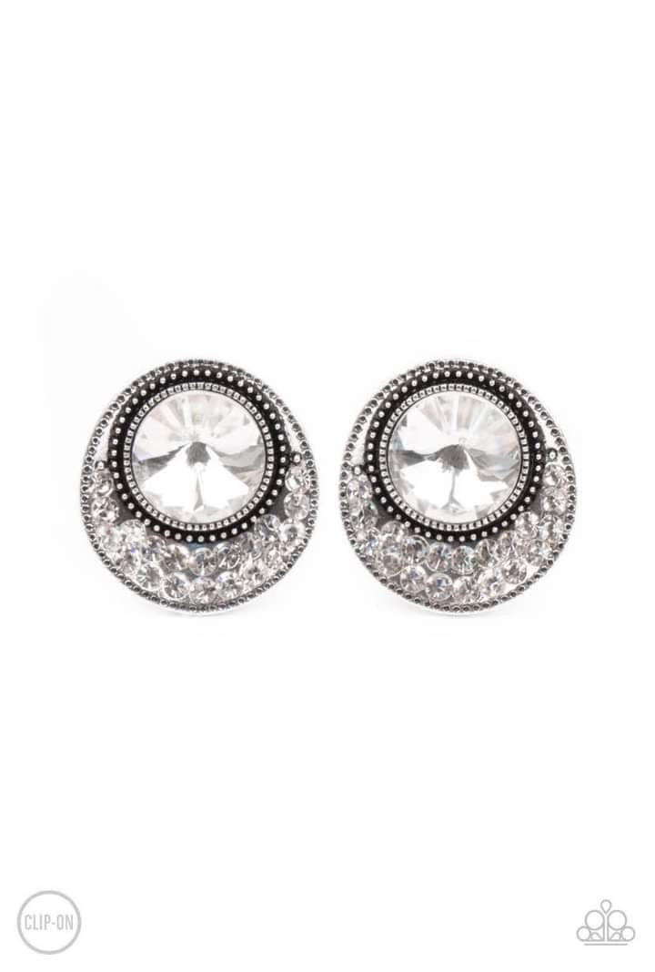 Dotted with an oversized white gem, the flared bottom of a studded silver frame is encrusted in row after row of glassy white rhinestones for a refined flair. Earring attaches to a standard clip-on fitting.