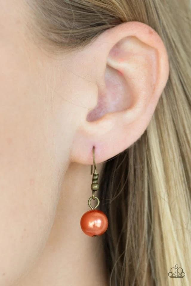 Double Linked Necklace with matching Earrings. Featuring pearly and glassy finishes, an array of brass, brown, and orange beads swing from a double-linked brass chain, creating a fancy fringe below the collar. Features an adjustable clasp closure.