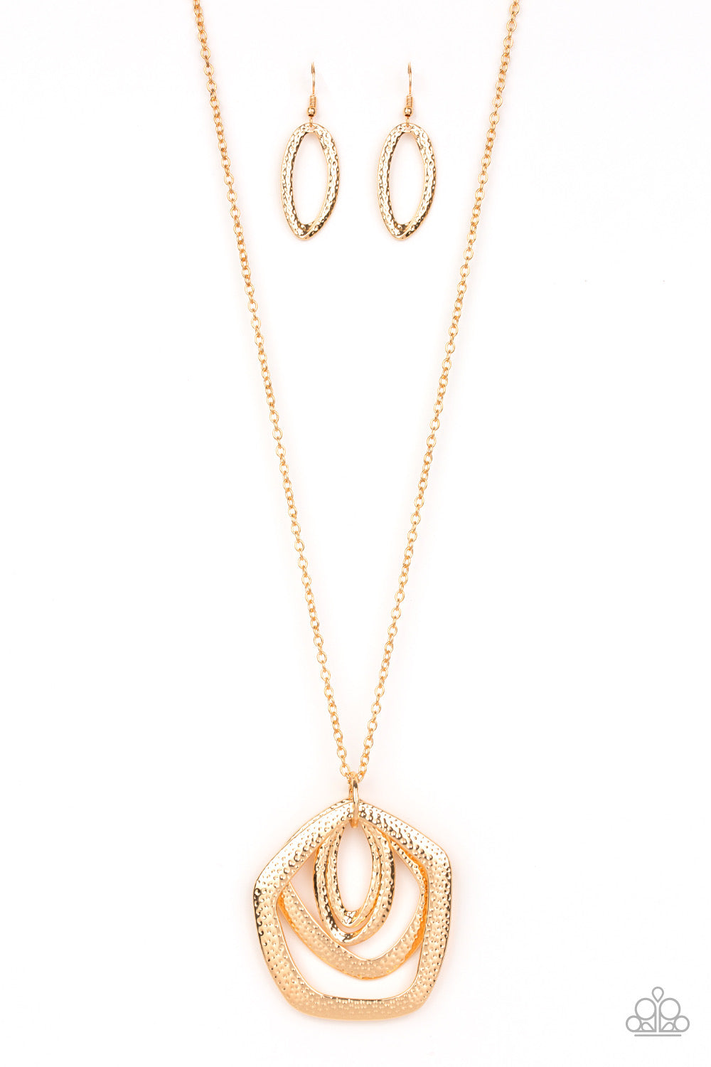 A collection of hammered geometric frames swing from the bottom of a lengthened gold chain, creating a bold artisan inspired pendant. Features an adjustable clasp closure.