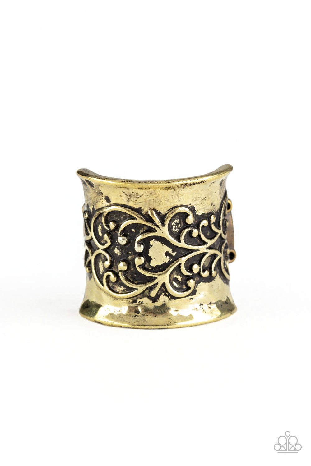 Vine-like brass filigree branches out across the front of an antiqued brass band, creating a seasonal centerpiece. Features a stretchy band for a flexible fit.
