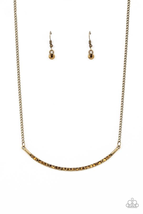 Encrusted in glitzy aurum rhinestones, a curved brass bar bows below the collar for a smoldering style. Features an adjustable clasp closure.