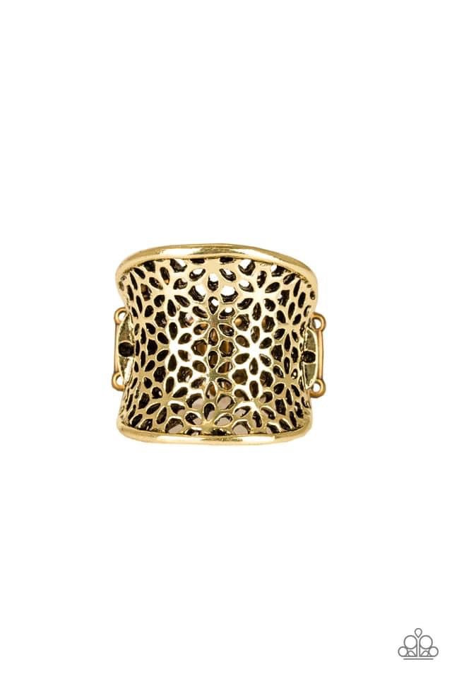 Stenciled in an airy floral pattern, a thick brass band curls around the finger for a whimsical springtime look. Features a stretchy band for a flexible fit.