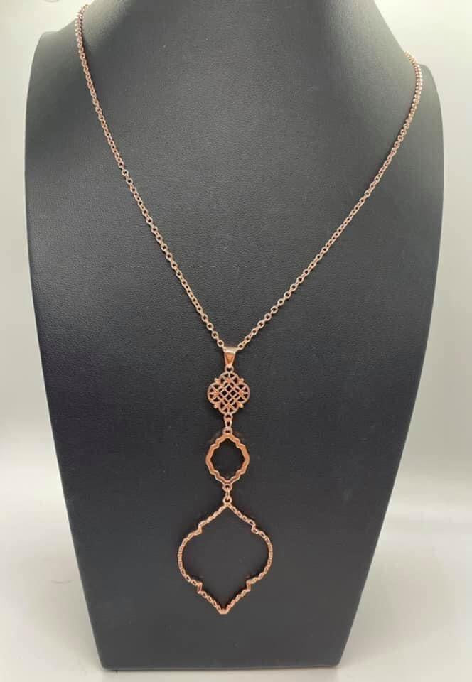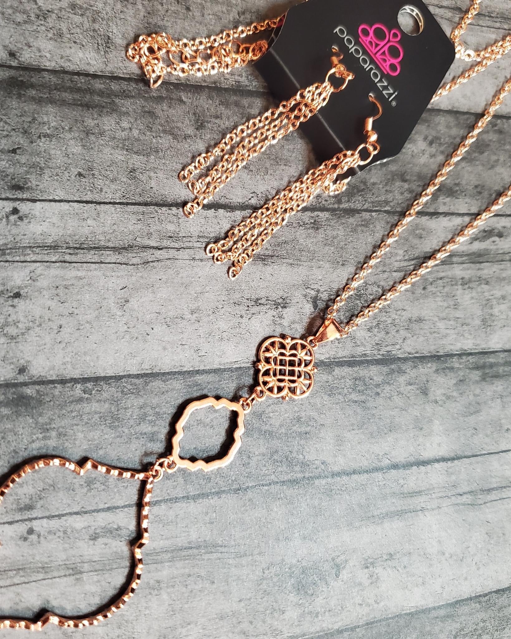 Featuring mandala-like patterns, a floral lattice frame gives way to mismatched scalloped copper frames, creating a magnificently stacked pendant at the bottom of an extended copper chain. Features an adjustable clasp closure. Sold as one individual necklace. Includes one pair of matching earrings.
