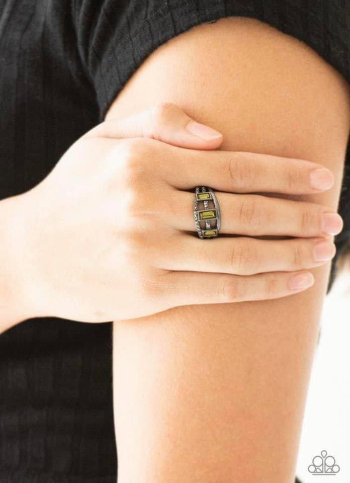 Three green emerald-cut rhinestones are encrusted along three gunmetal bands radiating with smooth surfaces and sections of glittery hematite rhinestones for an edgy fashion. Features a stretchy band for a flexible fit.